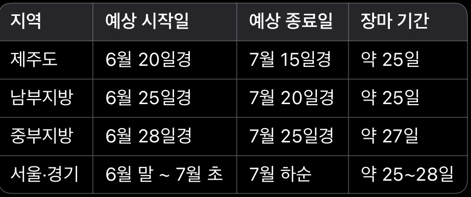 - 기상청의 평년값(30년 평균 기준)은 제주 6/19→7/20, 남부 6/23→7/24, 중부 6/25→7/26로 나타나며, 2025년 장마 예상도 이와 거의 동일합니다.